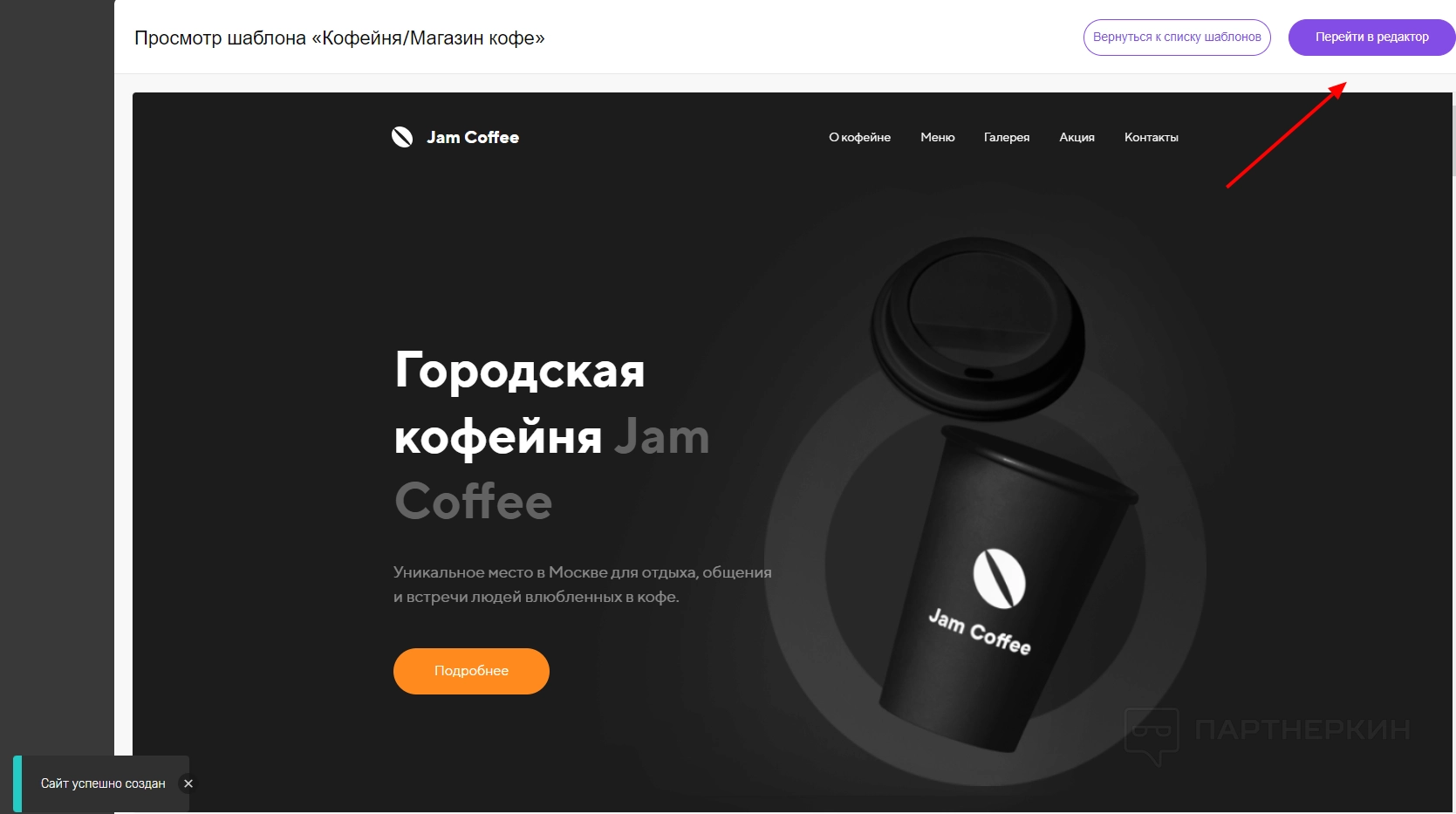 После выбора шаблона внизу страницы появится уведомление «Сайт успешно создан». Для детальной настройки перейдем в редактор (если шаблон не понравился пользователю, можно вернуться обратно и выбрать другой вариант).