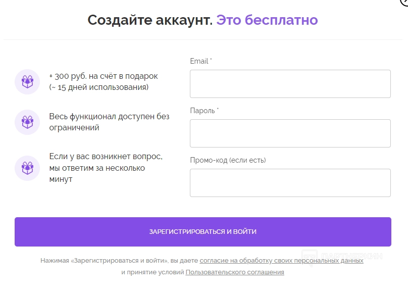 Чтобы создать аккаунт, на главной странице необходимо нажать кнопку «Регистрация». Откроется форма, где пользователю нужно заполнить несколько полей:
