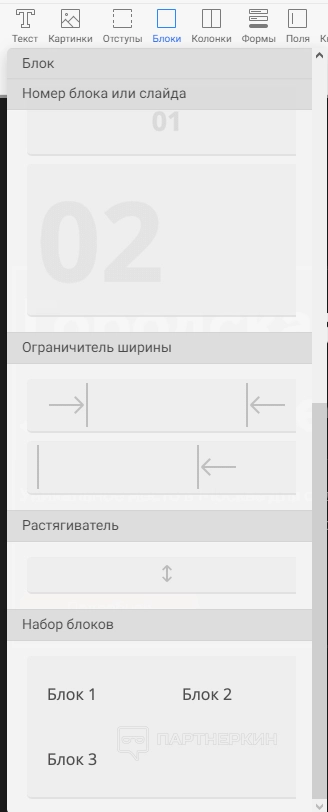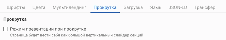 Прокрутка . В этой вкладке можно включить опцию «Режим презентации при прокрутке» (страница будет вести себя как большой вертикальный слайдер секций).