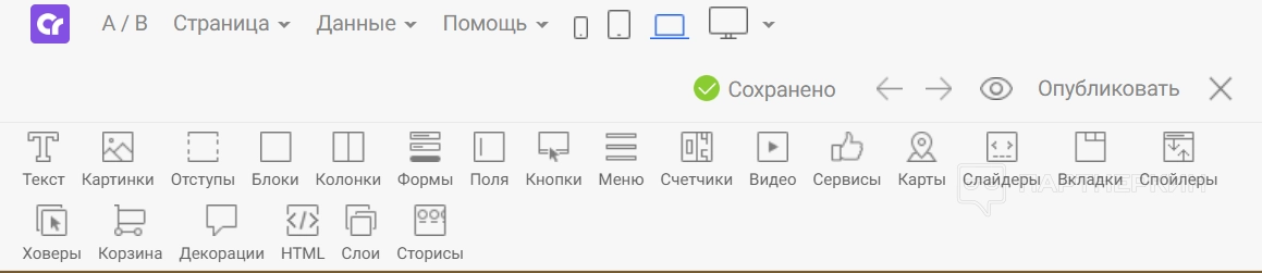 - Адаптивность . Сайт будет хорошо выглядеть на экране компьютеров, ноутбуков, планшетов и мобильных телефонов. Редактор автоматически адаптирует содержимое сайта.