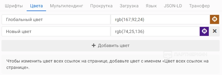 Цвета . Чтобы изменить цвет всех ссылок на странице, необходимо добавить цвет с именем «Цвет всех ссылок на странице».