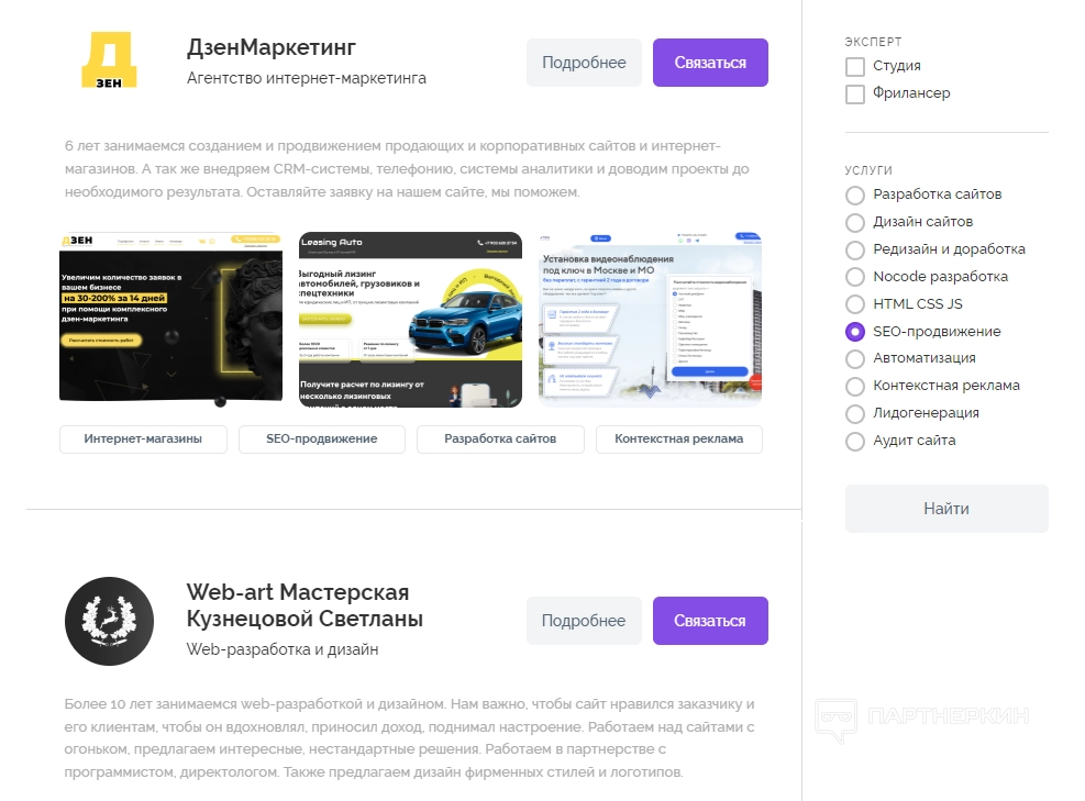 Пользователь выбирает в фильтре нужную услугу, находит понравившуюся компанию и нажимает «Связаться».