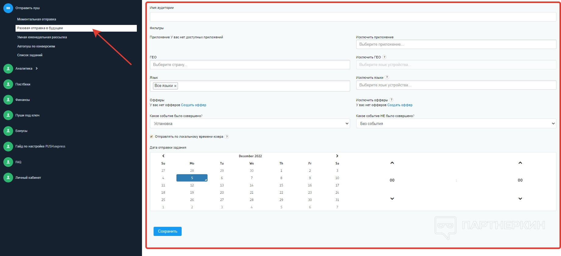 - Разовая отправка в будущем. В этой вкладке настраивается отправка пуш-уведомления по определенным датам. Для этого нужно указать данные, выбрать дату отправки и сохранить позицию.