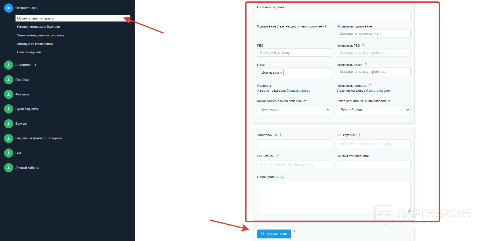 Далее идет раздел «Отправить пуш», разделенный на несколько вкладок: