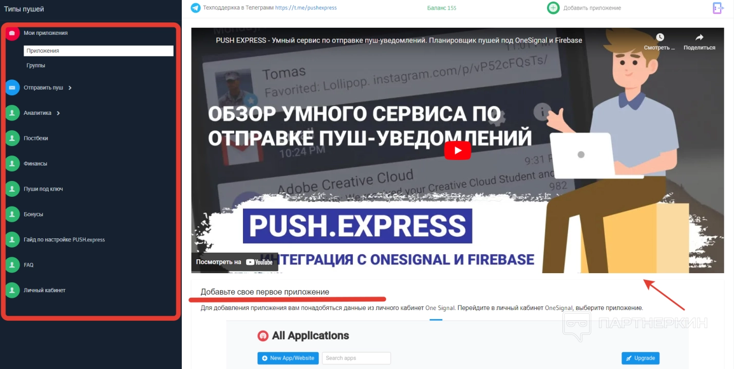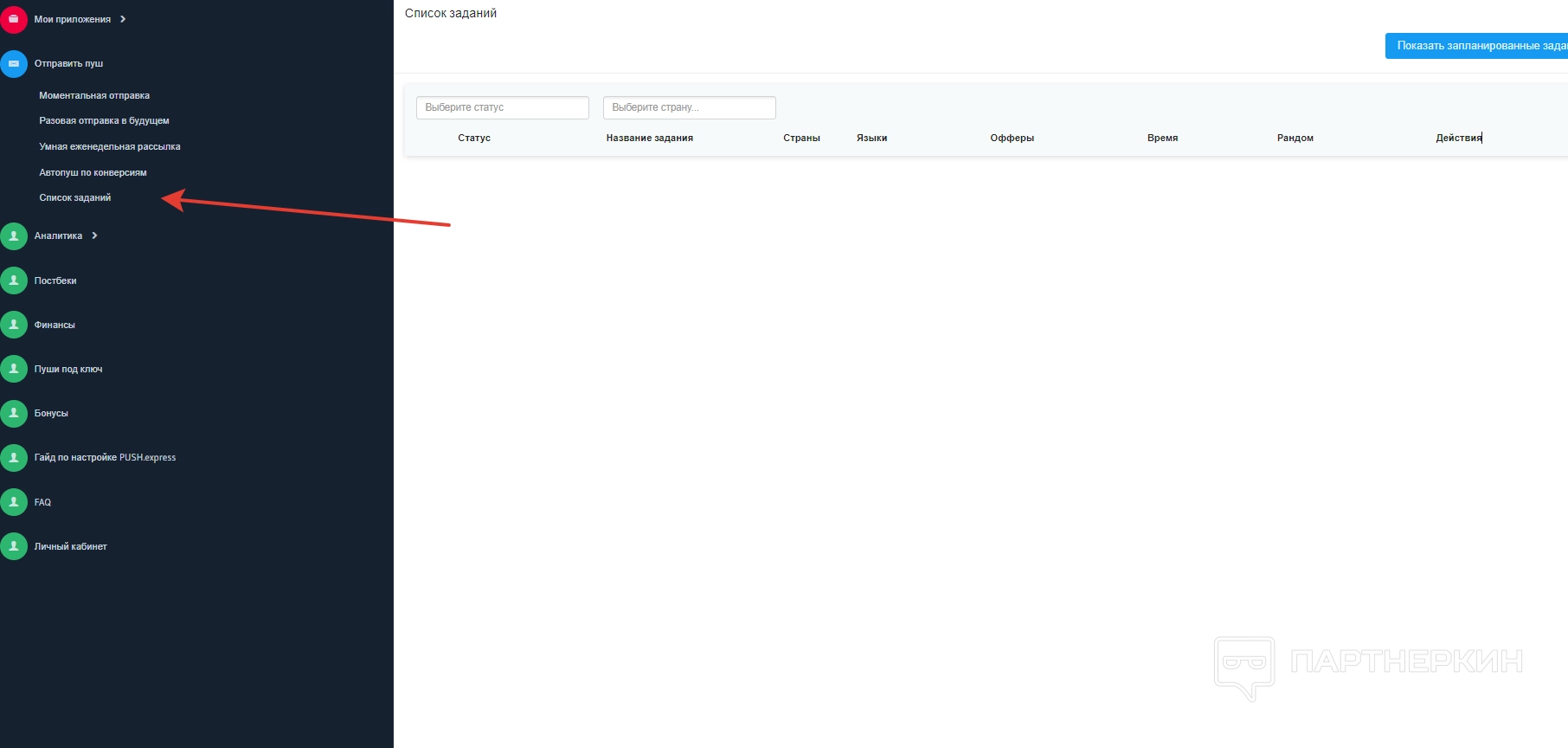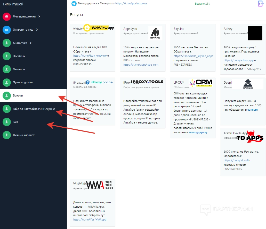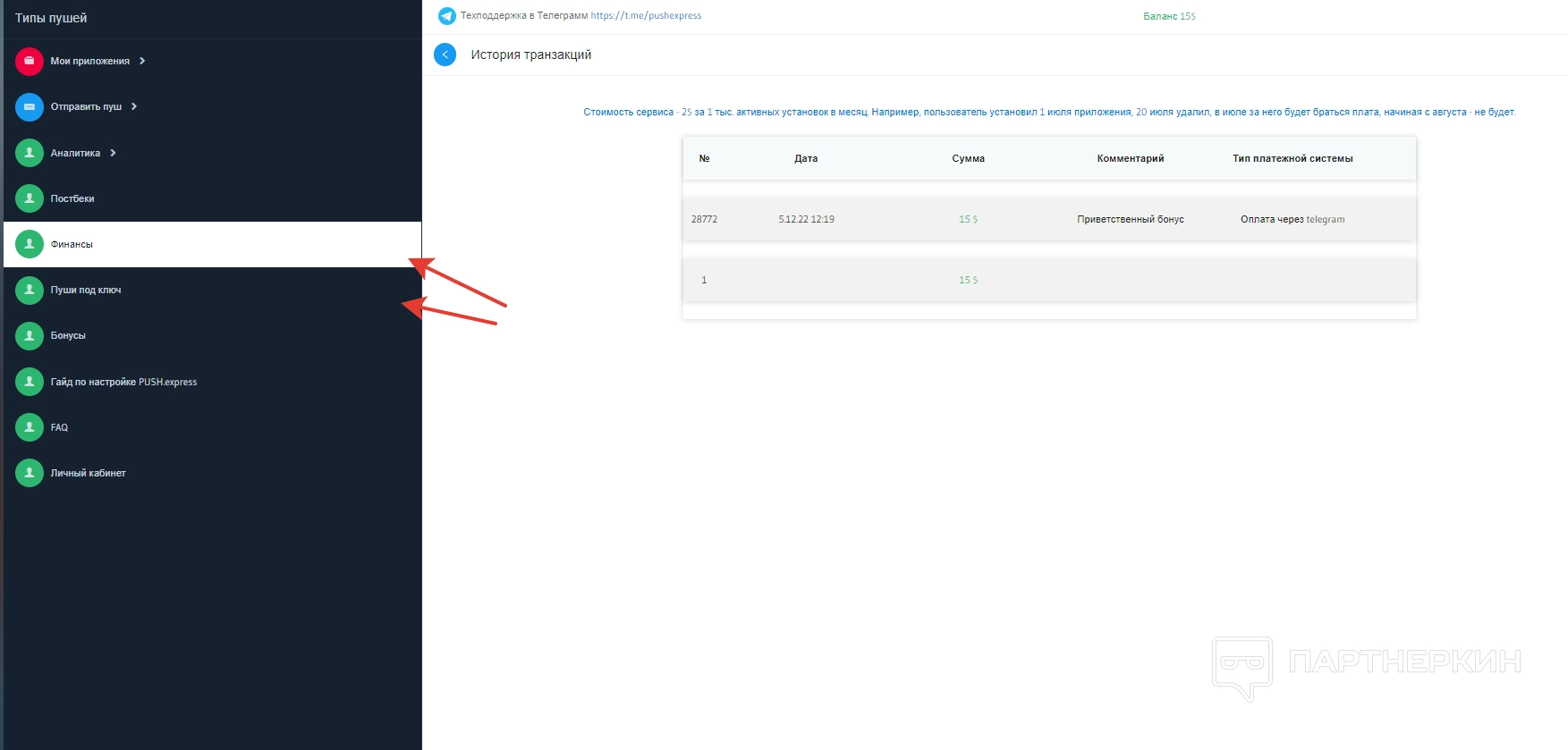 Следующий раздел — «Финансы». В нем отображается количество имеющихся средств и история транзакций. Что касается раздела «Пуши под ключ», она отображает все пуши, распределенные по группам.