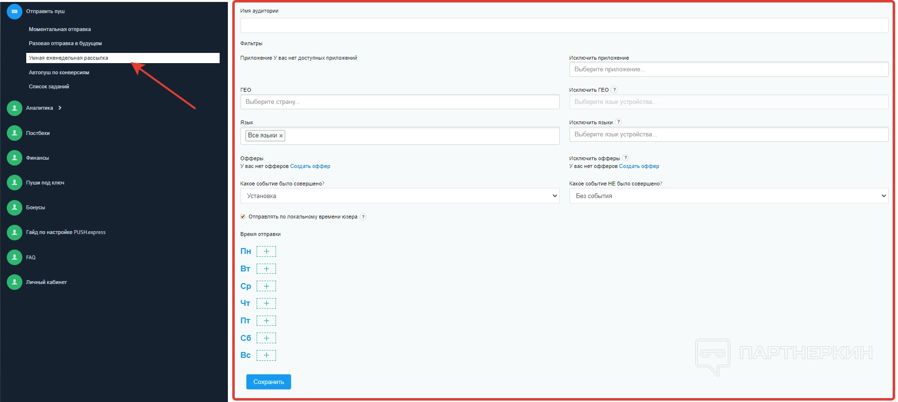 - Умная еженедельная отправка. Здесь можно настраивать отправку пушей по дням в конкретно указанное время.