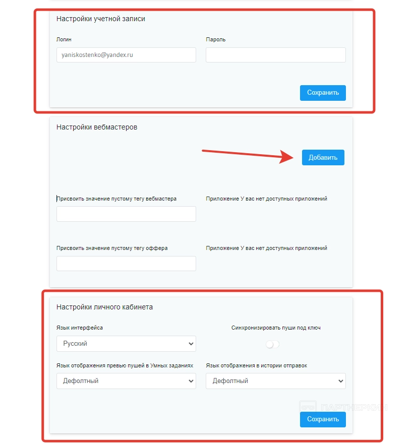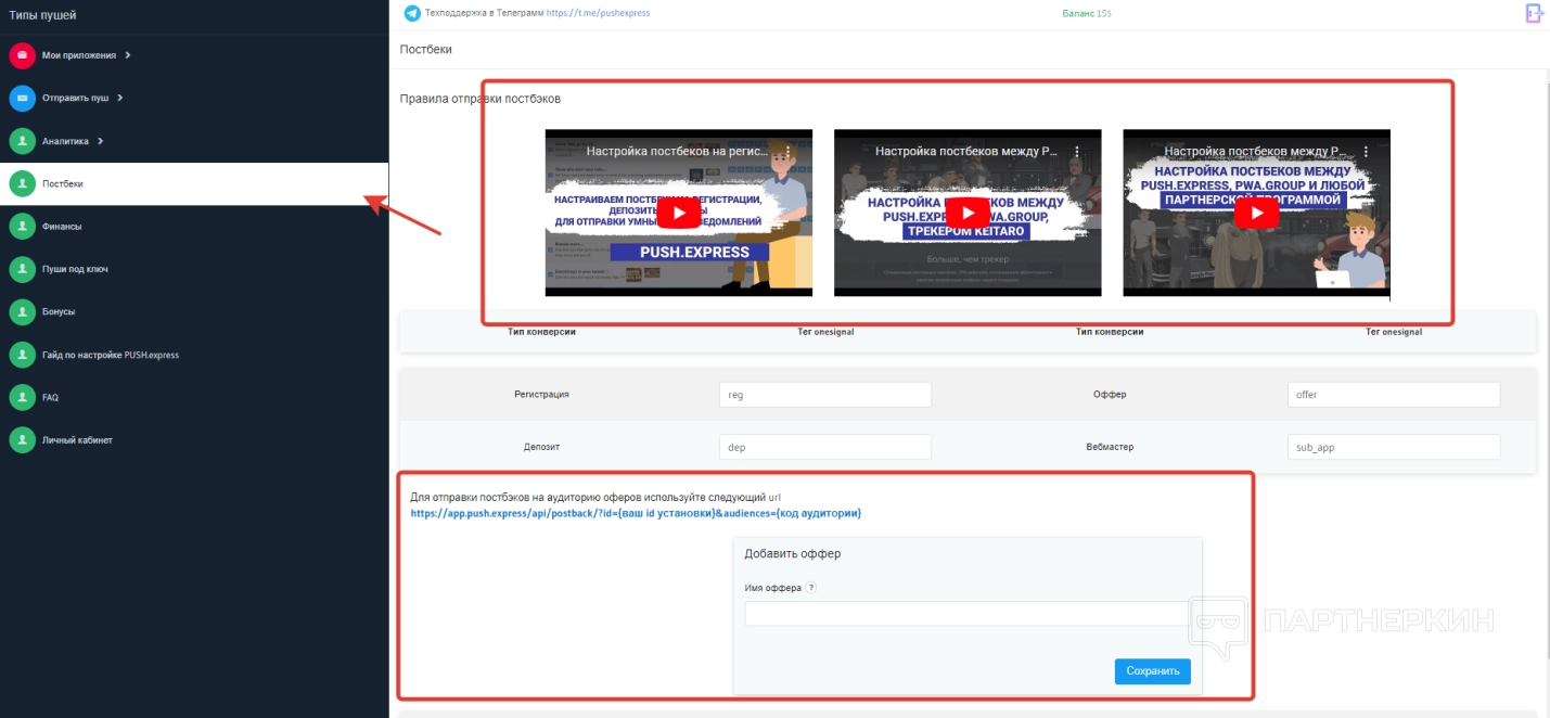 В разделе «Постбэки» есть 3 видеоролика, в которых рассказывается о правилах настройки постбэков. Ниже выделена форма, куда можно вносить офферы.