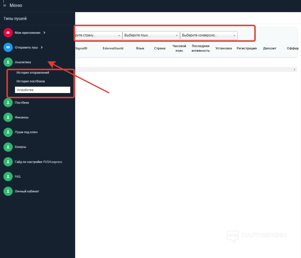 Следующим разделом идет «Аналитика», где можно смотреть историю отправлений, постбэков и статистику по устройствам, которым отправлялась рассылка. Для этого есть фильтр, отделяющий устройства по стране, языку и конверсии.