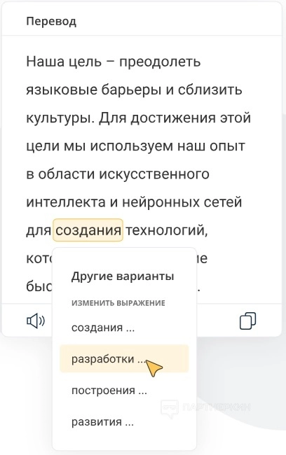 После того, как текст будет переведен, можно в режиме реального времени сразу скорректировать его. Например, если не устраивает слов или фраза, можно кликнуть на нее, и