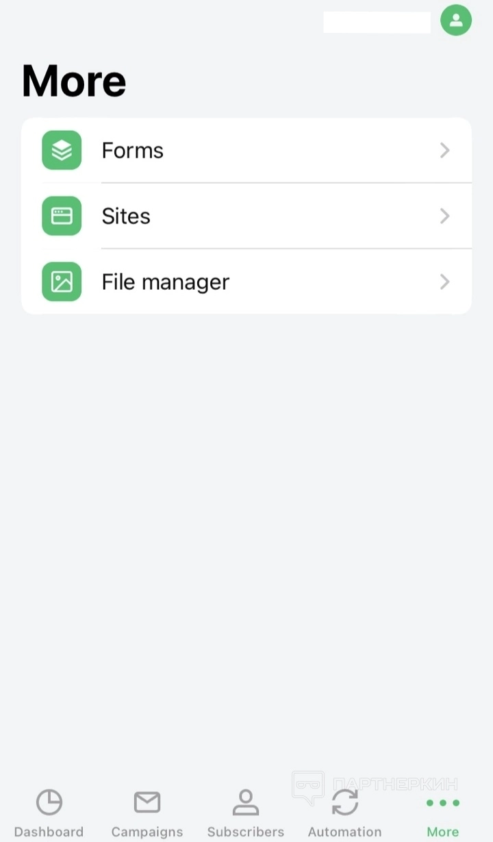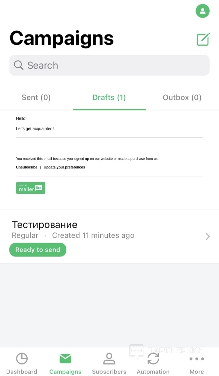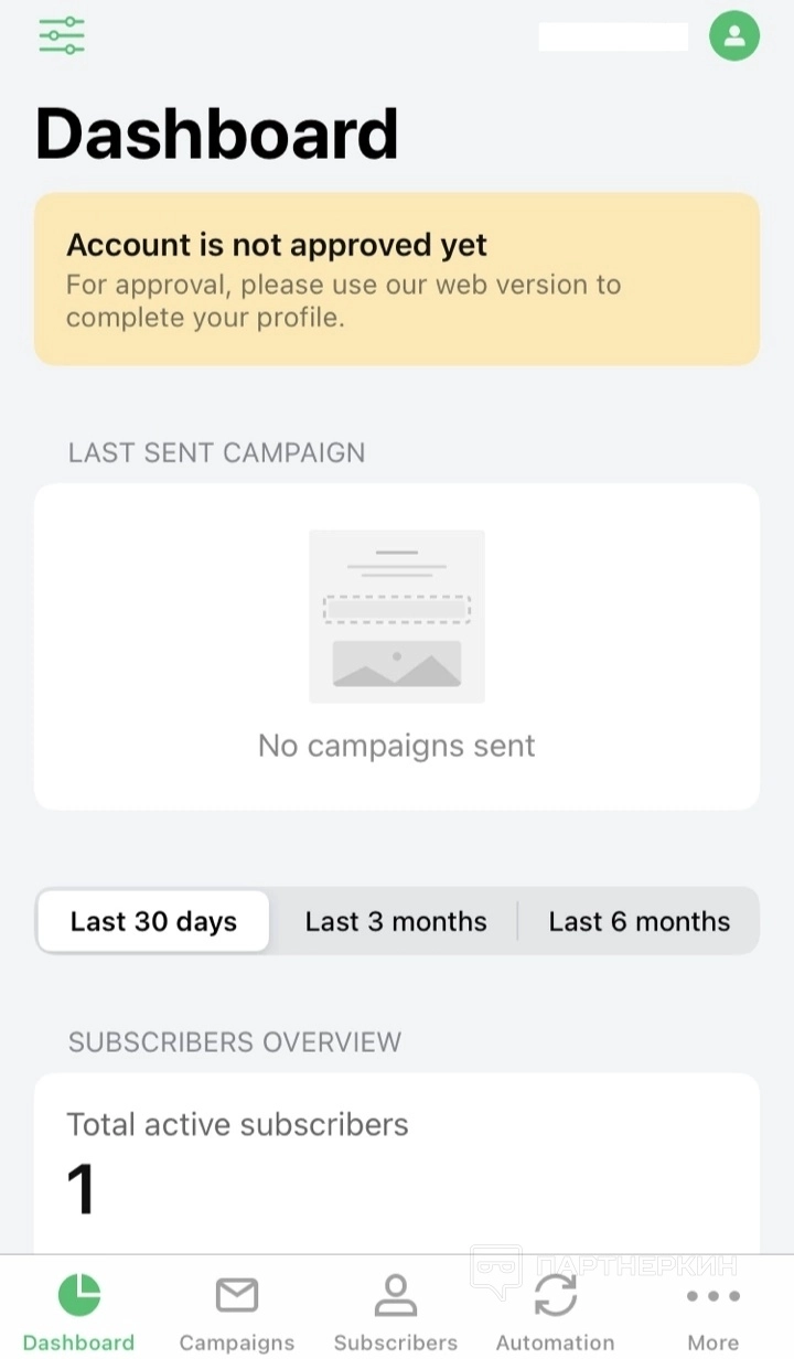 Так выглядит главная страница приложения после авторизации. Рабочая панель достаточно сильно отличается от своей веб-версии, поскольку на главной странице нет кнопок для создания кампаний или других проектов. При этом здесь отображается последняя отправленная кампания и количество активных подписчиков в клиентской базе.