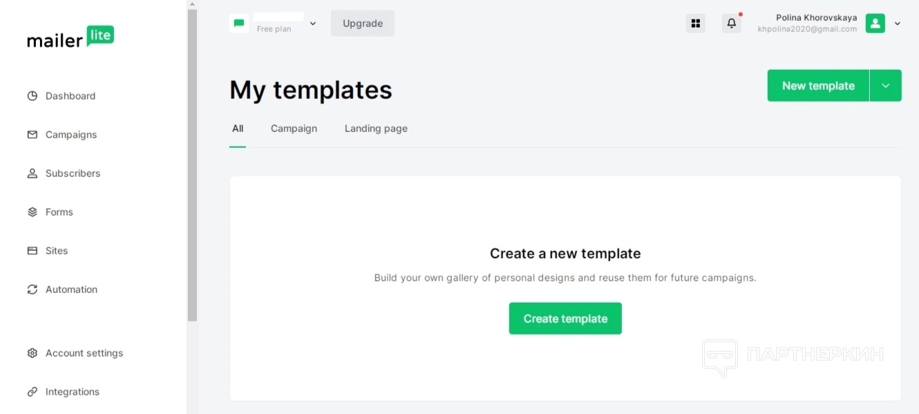В Шаблонах пользователь может хранить ранее созданные шаблоны кампаний или лендинг-страниц, которые в дальнейшем также можно заново использовать в своей работе. Создавать их можно отсюда либо сохранять готовые проекты в качестве шаблона.