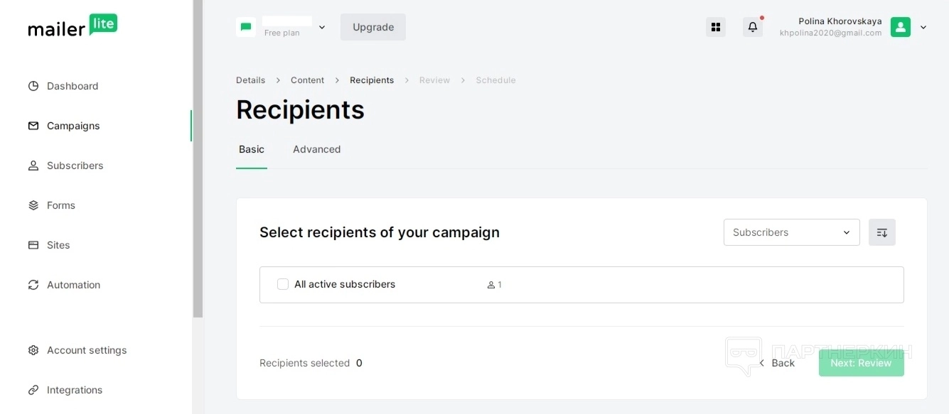 Первым делом пользователь выбирает кому будет отправлена данная кампания. По умолчанию, почтовый ящик, указанный при регистрации, является первым контактом в базе данных. Для предпросмотра или тестового запуска всегда можно указывать его.