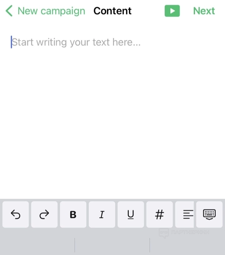 Далее необходимо добавить контенте наполнение письма. Стоит отметить, что в мобильной версии сервиса автоматически открывается текстовый редактор. Если пользователь хочет выбрать редактор перетаскивания или HTML, то ему придется использовать свой ПК.
