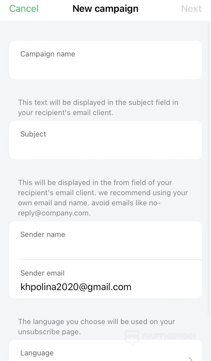 Первым делом даем название, указываем отправителя и его адрес, а также выбираем язык будущего письма (русский в списке есть, но к сожалению не устанавливается).