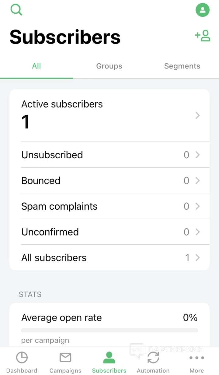 В разделе Подписчики пользователь получает углубленный доступ к своей базе данных. Здесь отображаются вкладки с группами подписчиков, объединенных по разным параметрам, их статистика и многое другое. Чтобы добавить новый контакт или сразу целый список, достаточно нажать на зеленую кнопку человечка с плюсом в правом верхнем углу. Принцип добавления новых клиентов идентичен веб-версии — файлом, текстом или вручную по отдельным параметрам.