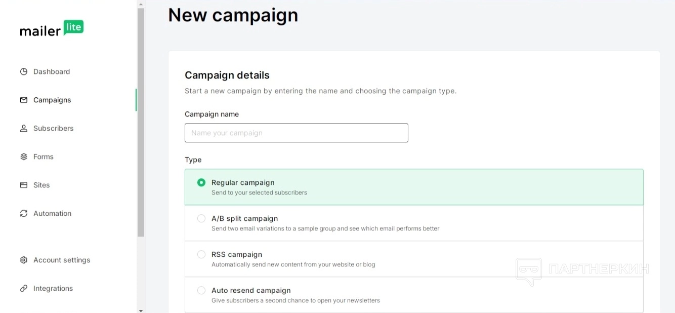 Чтобы создать рассылку, заходим в раздел Кампании и нажимаем на кнопку Create. В открывшемся окне нужно выбрать тип кампании и дать ей название.