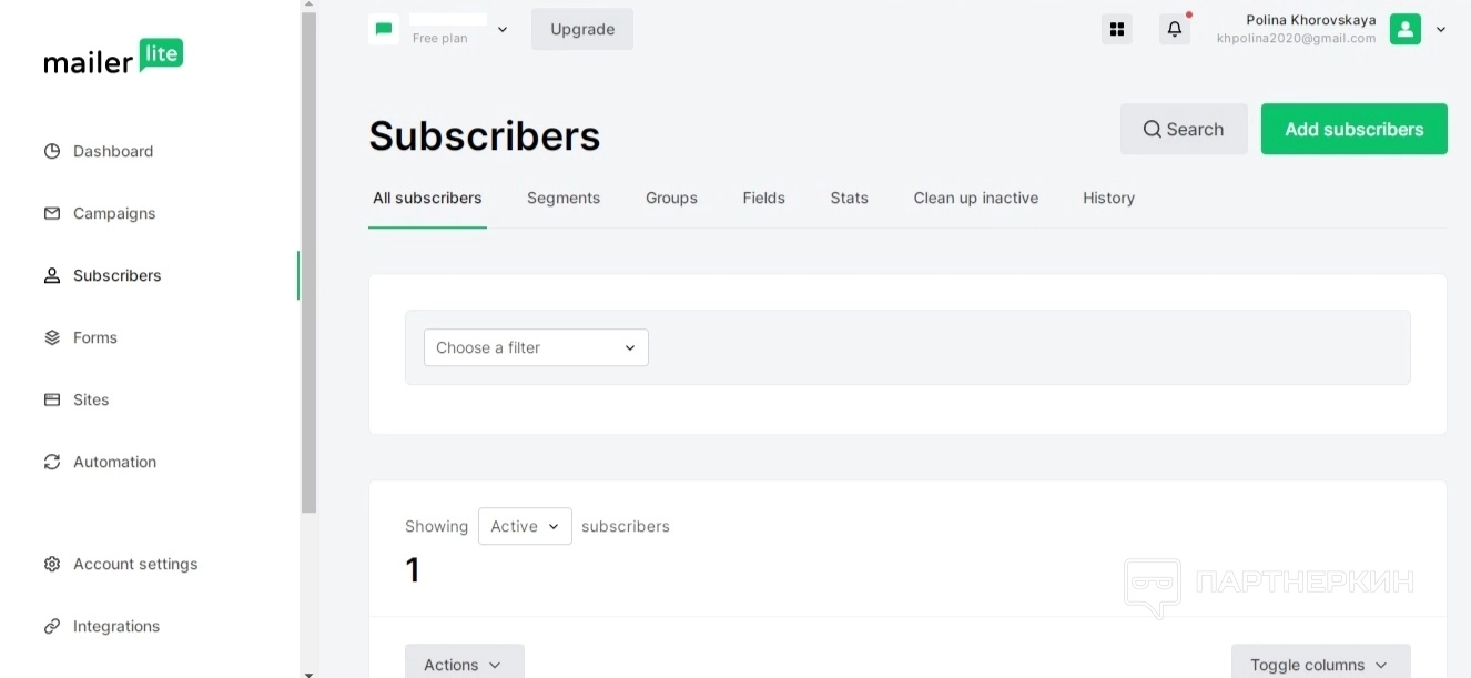 Следующий важный раздел — Подписчики . Здесь загружается существующая база подписчиков, а также добавляется новая после сбора информации. Раздел достаточно обширный, поскольку имеет сразу несколько вкладок, каждая из которых отвечает за тот или иной инструмент для работы с клиентами. Здесь можно создавать группы подписчиков по подходящим параметрам, просматривать статистику их активности, чистить базу и так далее.