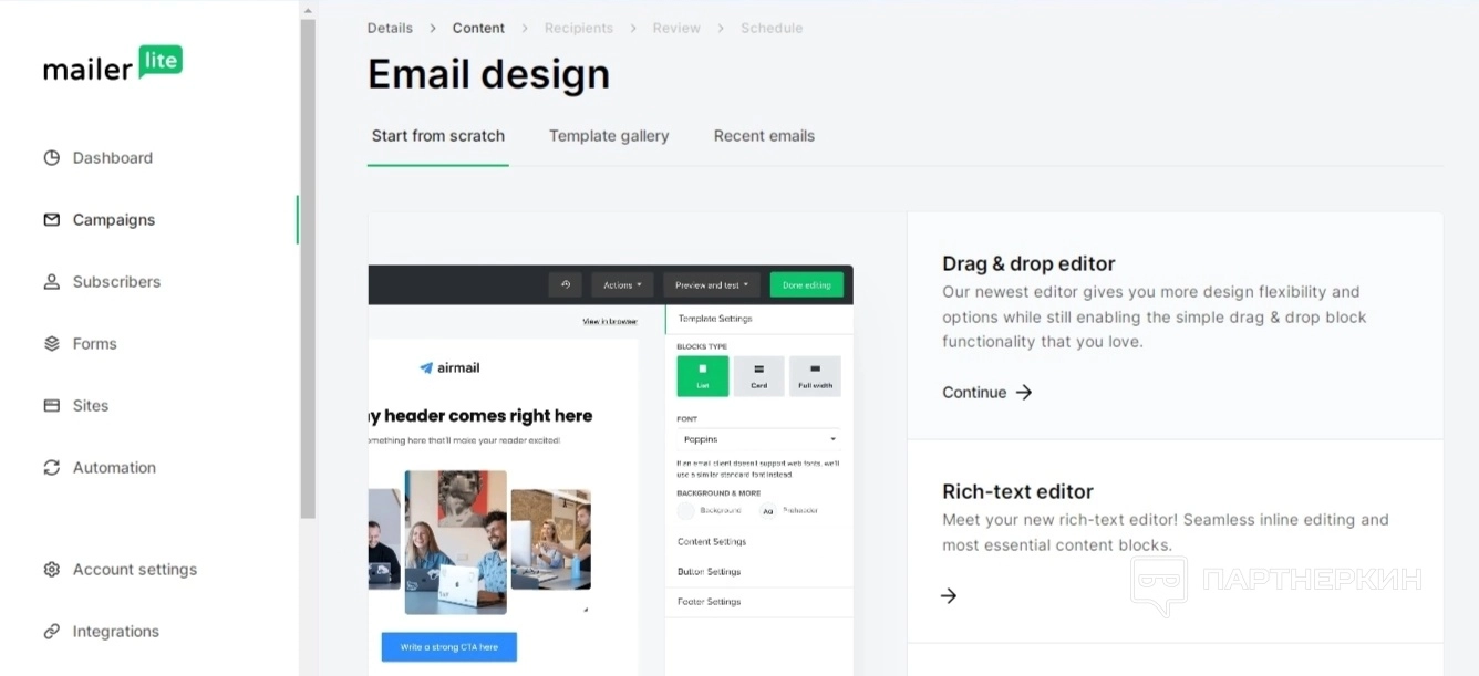 Следующий шаг — выбор редактора, с помощью которого будет создаваться письмо. Как говорилось ранее, платформа предлагает их три вариации, подходящие для любого уровня навыков.