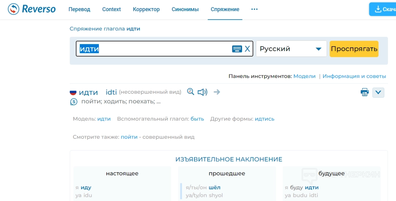 - спряжение — к указанному слову система указывает спряжение, вероятные формы, наклонение и показывает, как спрягать глагол.