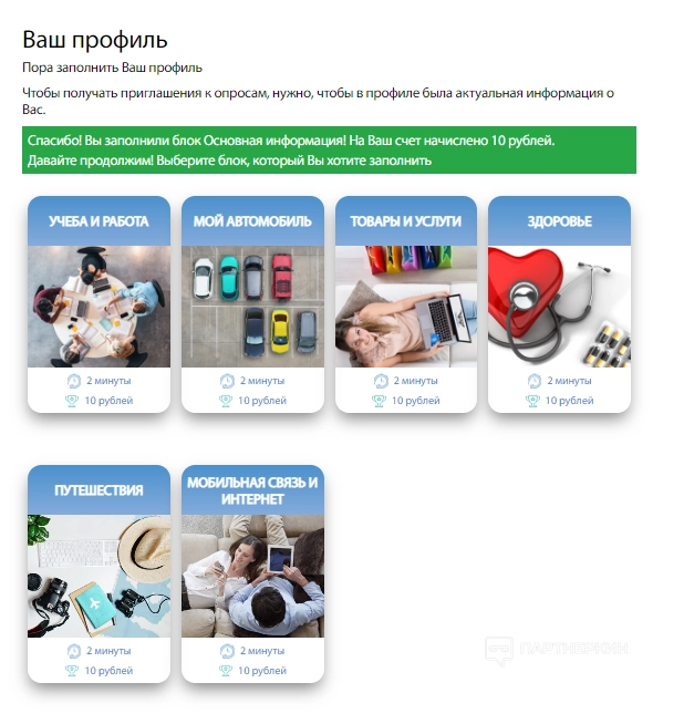 При желании можно увеличить количество возможных опросов за счет прохождения дополнительных анкетирований для заполнения профиля. К тому же за это пользователь получает приветственный бонус — 10 рублей за каждый опросник, соответственно. Хотя, стоит отметить, что обещали 80 рублей, а по итогу получится только 70 за все блоки. Потеря 10 рублей — мелочь, но и приятного мало.