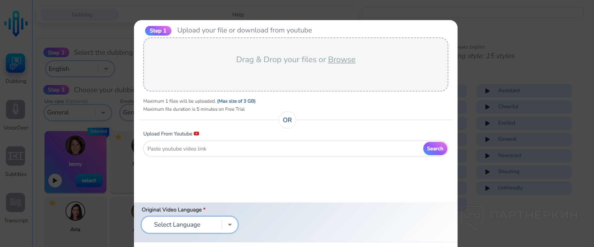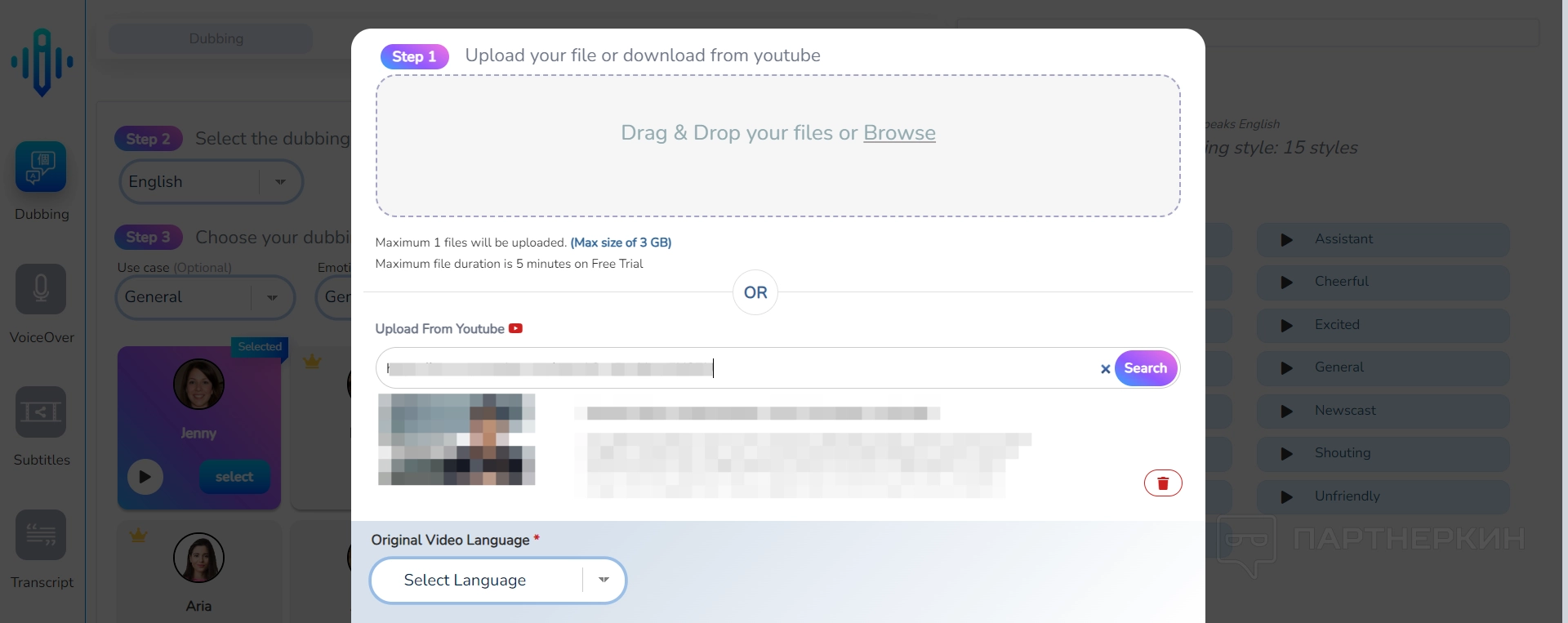 Сначала пользователь просто нажимает на кнопку в рабочем пространстве под названием «Generate Dubbing». После этого необходимо загрузить нужный видеоролик, либо вставить ссылку на него в YouTube.