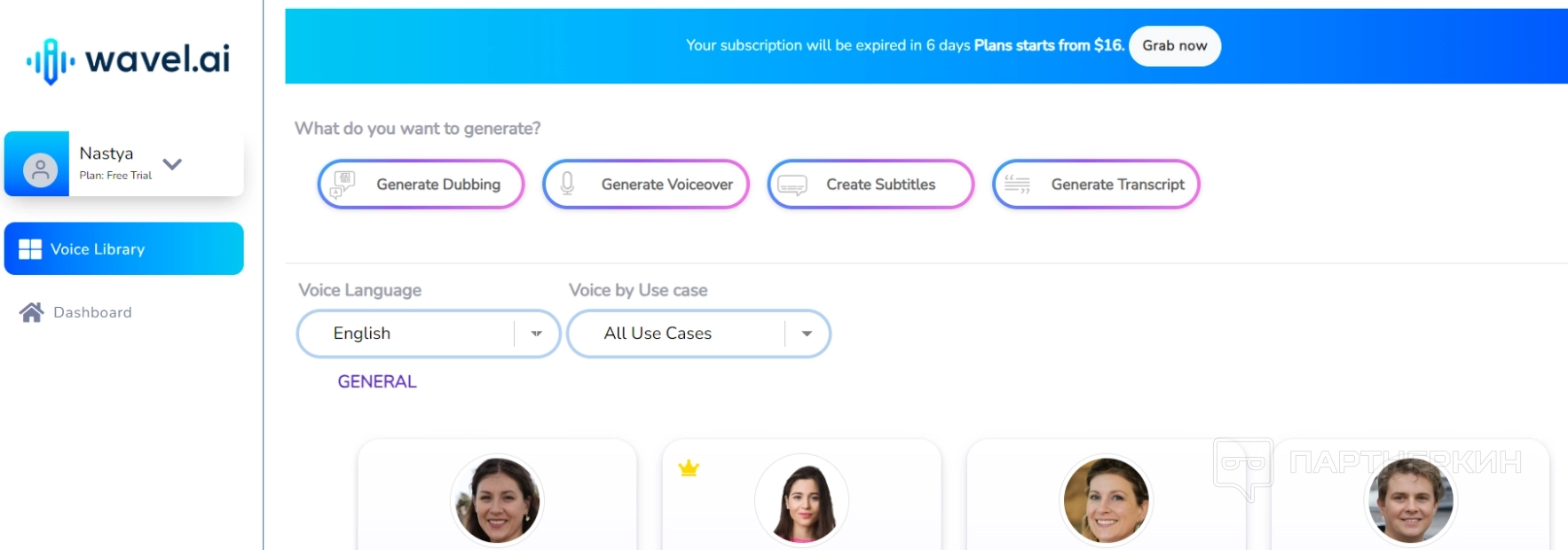 После регистрации пользователь попадает в рабочий кабинет платформы. Тестовый период длится 6 дней, при этом выдается 15 бесплатных кредитов для создания первых дубляжей.