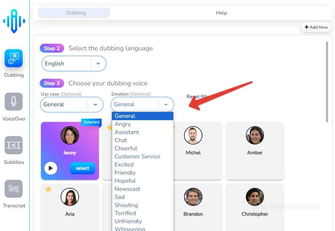 Потом остается выбрать голос спикера — для упрощения поиска можно сразу указать категорию ролика, а также эмоциональность. Например, можно выбрать категорию аудиокниг и отметить дружелюбную тональность спикера.