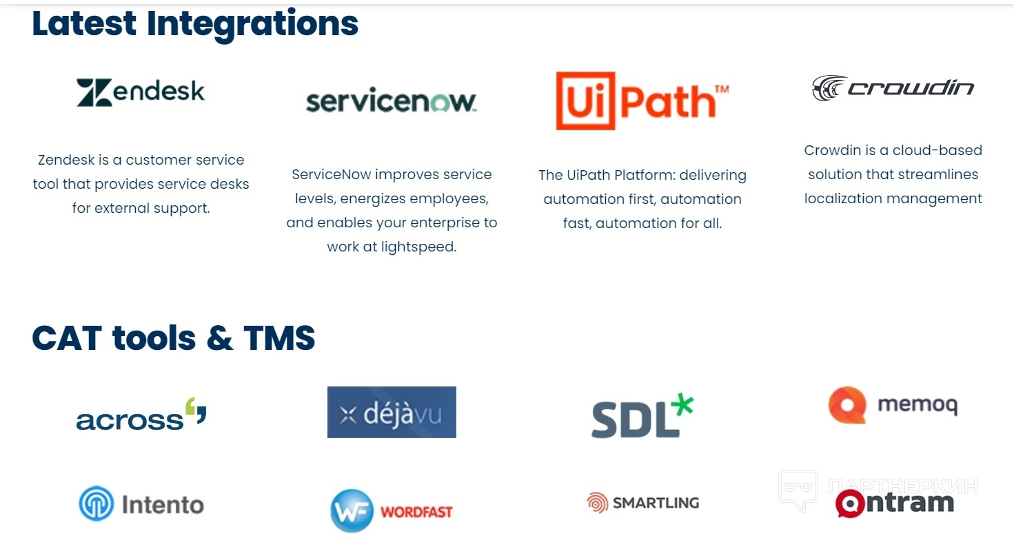 Простая интеграция с Salesforce, ServiceNow и Zendesk расширяет возможности обслуживания клиентов в глобальном масштабе. При непосредственной интеграции в рабочий процесс поддержки Zendesk осуществляется перевод в режиме реального времени. Служба поддержки клиентов получает возможность общаться на 55 языках через 150 языковых пар.