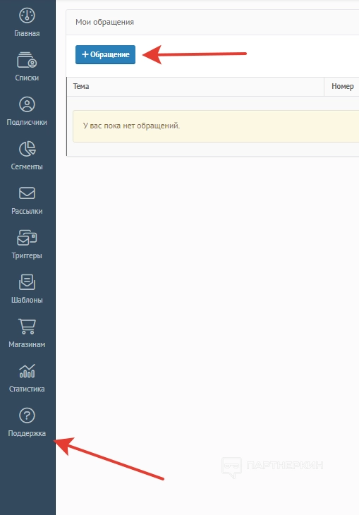 Чтобы связаться с техподдержкой, открываем раздел «Поддержка» и кликаем на кнопку «Обращение» в левом верхнем углу.