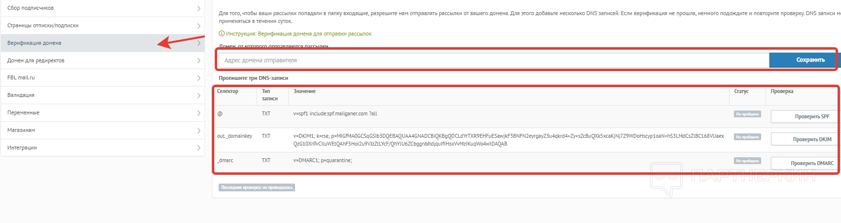 С остальными же разделами придется немного поработать. Например, в блоке «Верификация домена» нужно указать адрес домена отправителя. Также придется прописать DNS-записи.