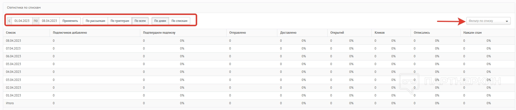 В данном разделе расположена таблица, отображающая статистику по рассылкам, триггерам и спискам. В верхней части блока можно выбирать определенную дату и тип рассылки. В правом верхнем углу предусмотрен фильтр по списку.