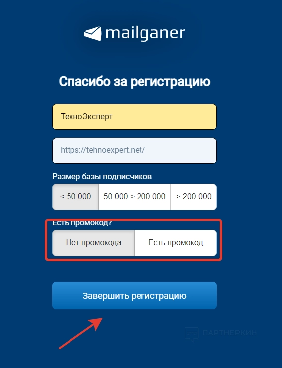 На следующем этапе вводим название своей компании, вставляем ссылку на сайт и указываем количество сотрудников. Если есть промокод, кликаем на «Есть промокод», вводим комбинацию и завершаем регистрацию.