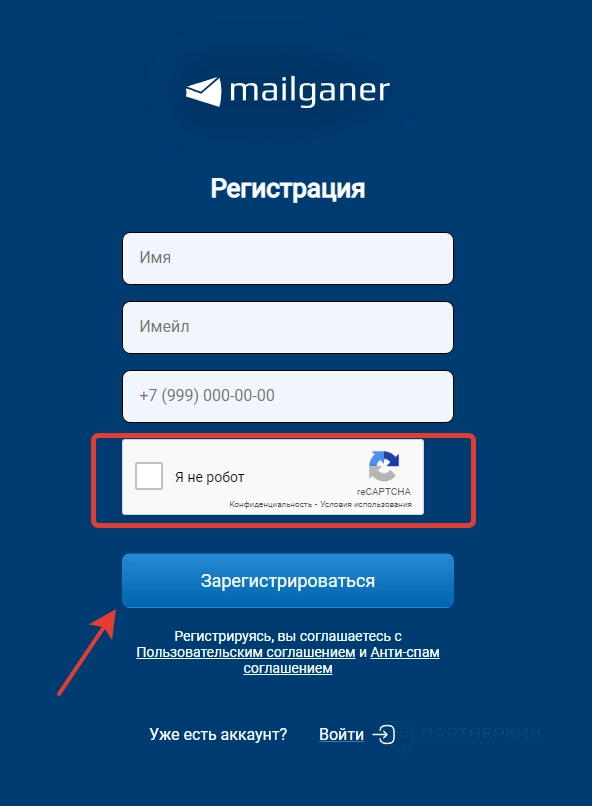 Если же пользователь хочет самостоятельно протестировать функционал, тогда придется регистрировать учетную запись. В первую очередь кликаем на кнопку регистрации в правом верхнем углу. Далее заполняем форму, где нужно указать имя, электронную почту, номер телефона. Проходим проверку капчи и жмем кнопку «Зарегистрироваться».