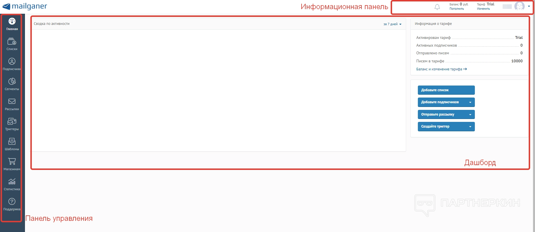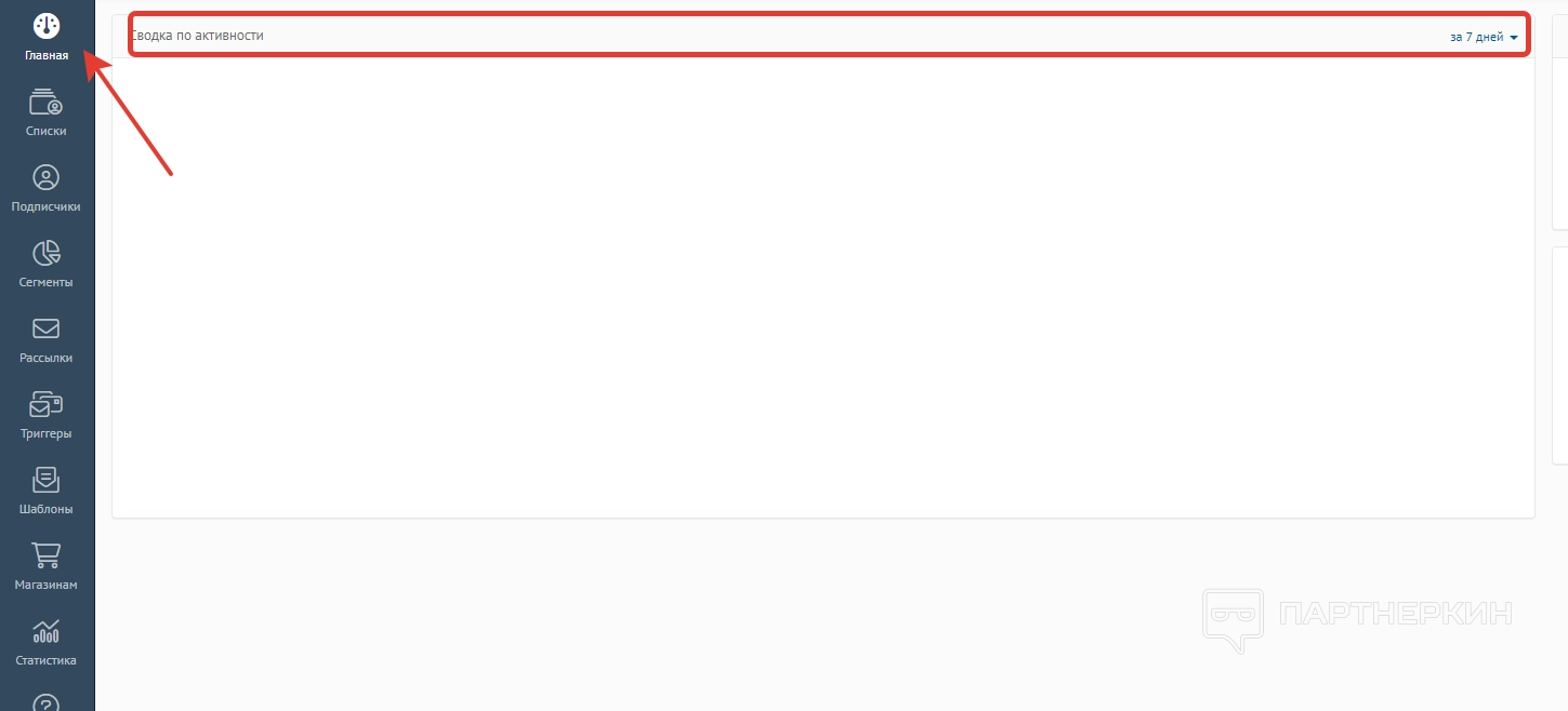 - дашборд — здесь отображаются данные из разделов, а также осуществляется настройка рассылки.