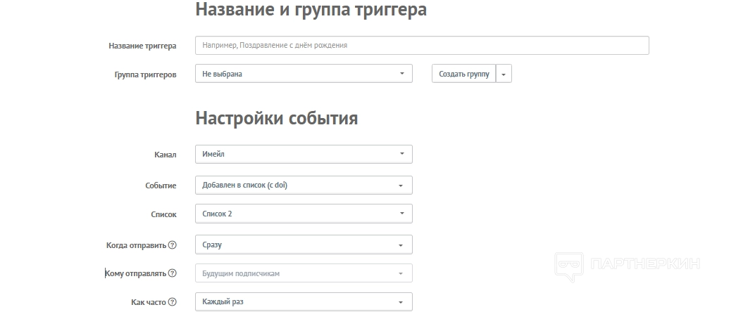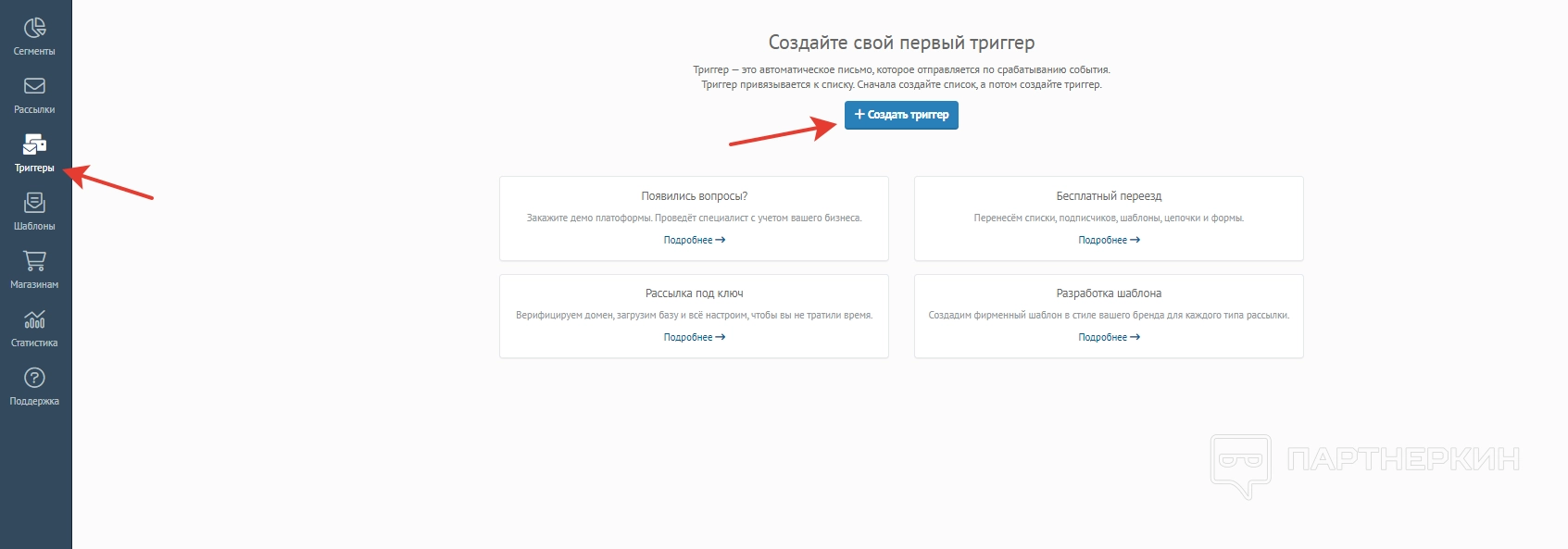 В этом разделе пользователь может создавать автоматические письма, которые будут отправляться по срабатыванию заранее установленного события. Для начала пользователь нужно перейти в соответствующий блок и кликнуть на кнопку «Создать триггер» в центре экрана.