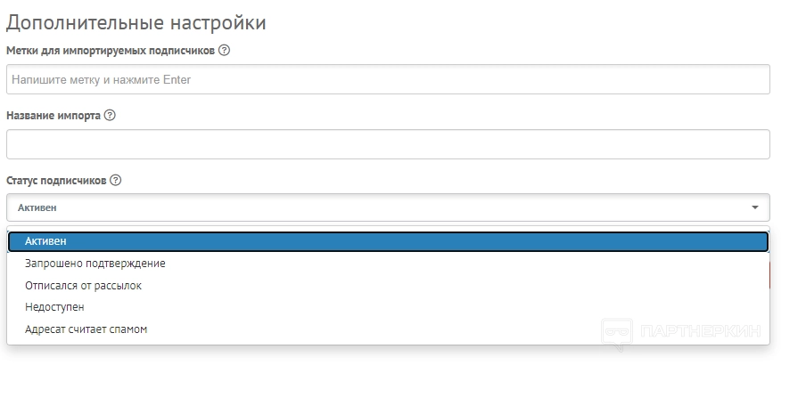 При необходимости можно откорректировать дополнительные настройки. Например, установить метку для подписчиков, что поможет в будущей работе с сегментами, дать название импорту и выбрать статус пользователей.