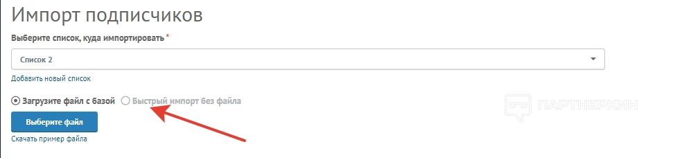 Импорт осуществляется несколькими способами. Можно загрузить файл в формате XLS или добавить контакты пользователей вручную, кликнув на «Быстрый импорт».