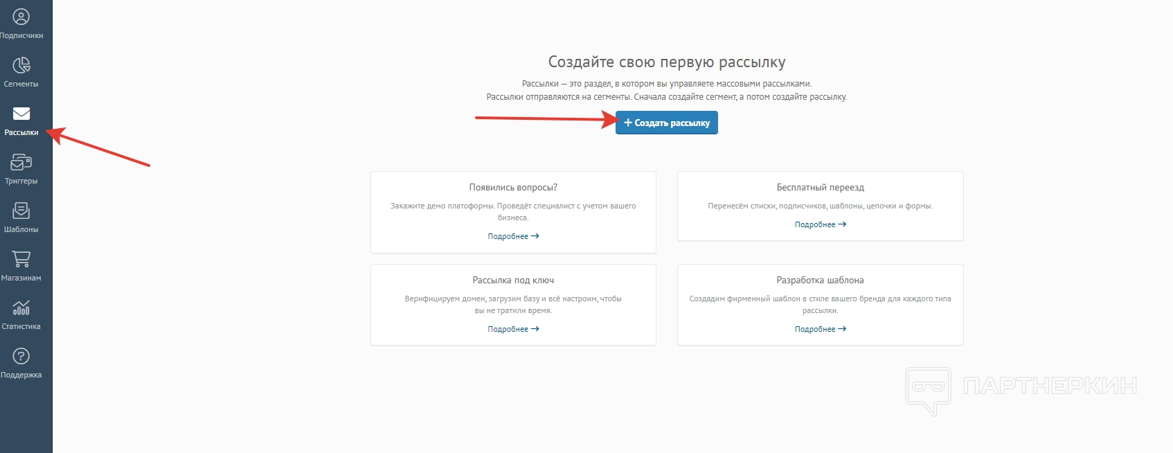 - рассылки — основной раздел, где осуществляется настройка рассылок;