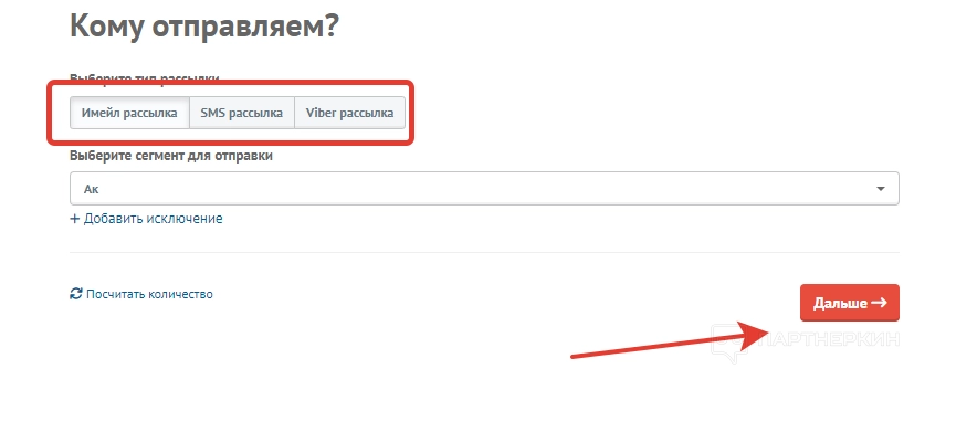 Теперь указываем заранее созданный сегмент и жмем на кнопку «Дальше».