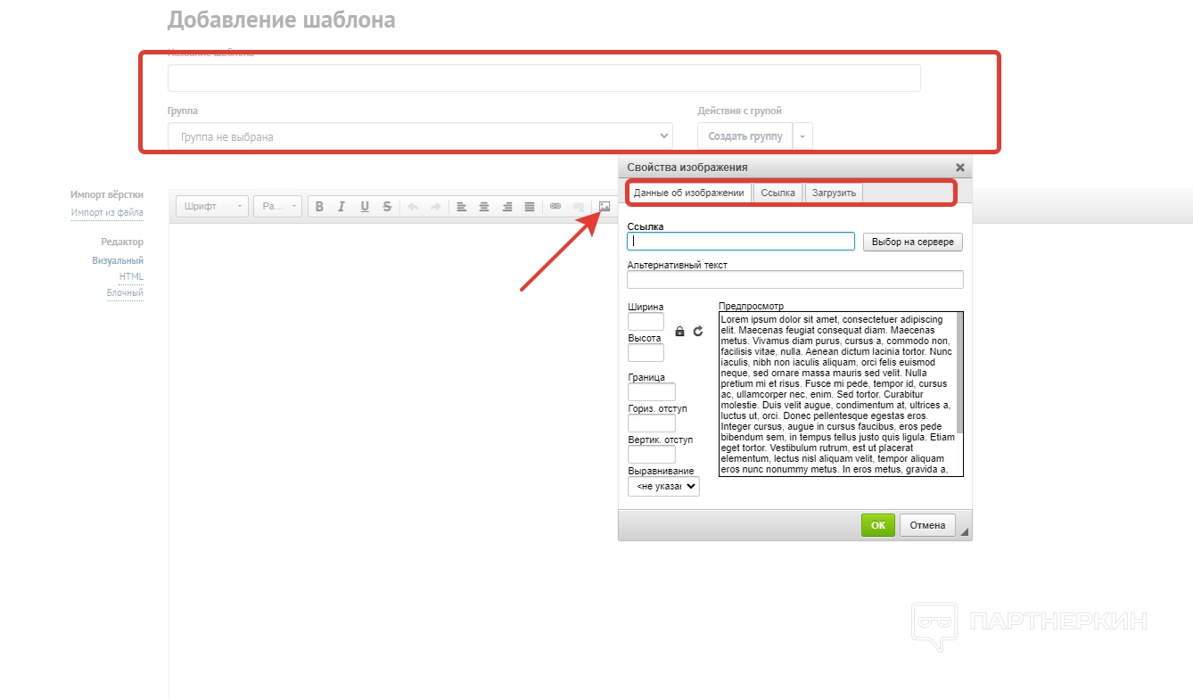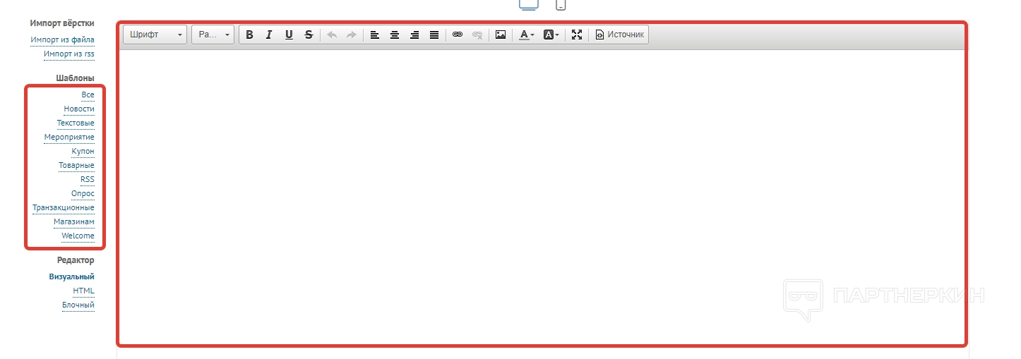 - Создаем письмо. Для этого предусмотрен полноценный текстовый редактор, где можно работать не только с текстом, но и медиаконтентом. Рядом с редактором есть панель, где можно сразу выбрать шаблон письма.