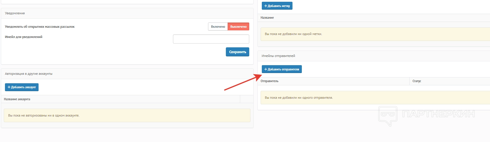 В нижней части раздела можно добавлять метки, сторонние аккаунты и новых отправителей. Для добавления отправителя нужно указать имя, электронную почту и список.