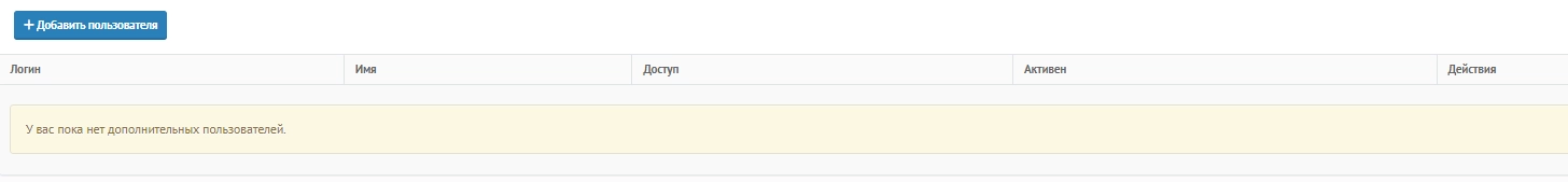 Добавленные юзеры будут отображаться в специальной таблице, которая разделяет их по имени, логину, доступу, активности и действиям.