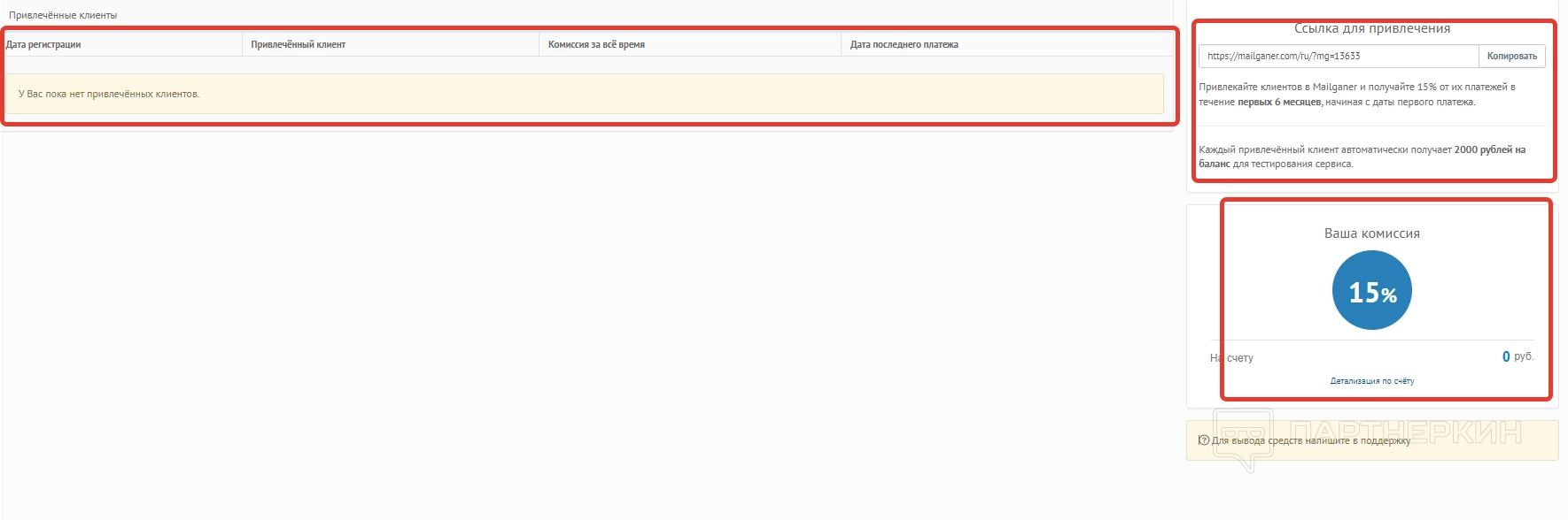 Раздел «Партнерская программа» отображает сведения по привлеченным клиентам: