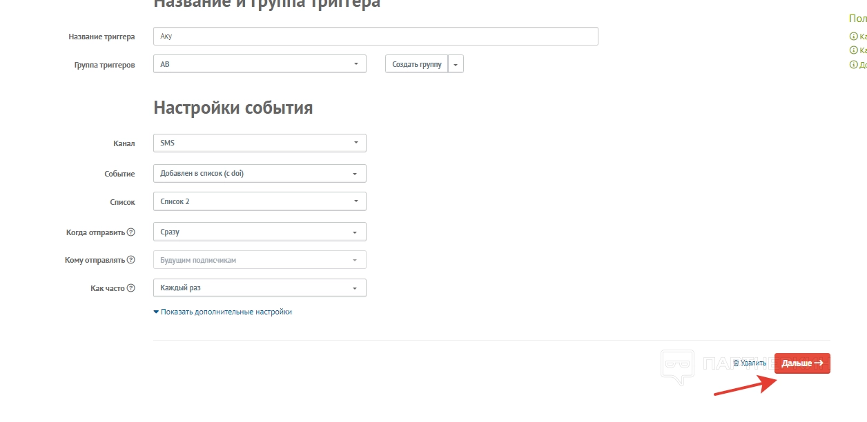 Для создания и настройки рассылки кликаем на соответствующую кнопку в центре экрана и попадаем в форму, где нужно откорректировать некоторые параметры.
