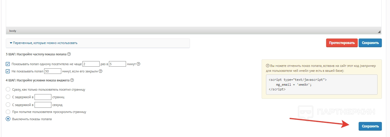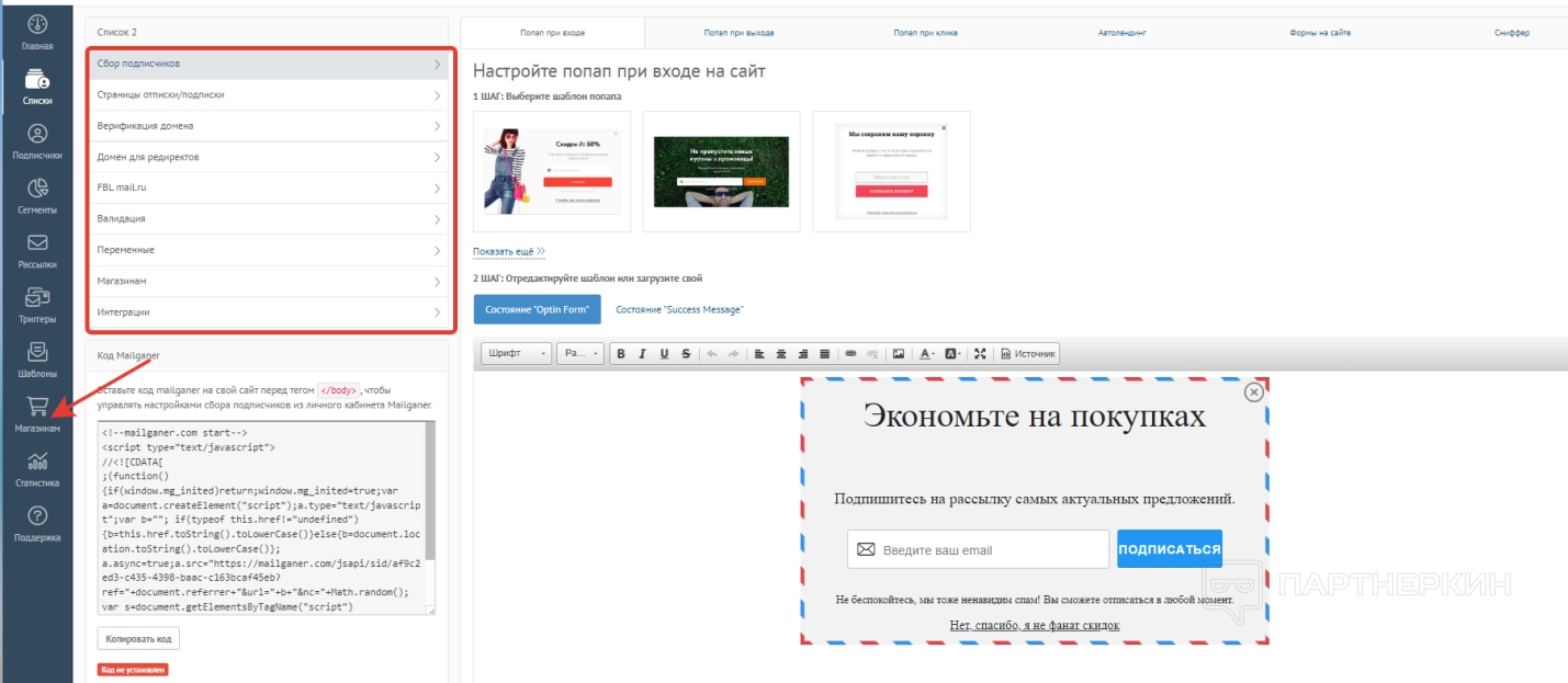 Разделы «Сбор подписчиков» и «Страницы отписки/подписки» пользователю не придется настраивать вручную. По умолчанию будут подготовлены все необходимые шаблоны с текстом, изображениями и настройками. Вебмастеру остается лишь внести изменения, добавить свои параметры и кликнуть на кнопку «Сохранить».
