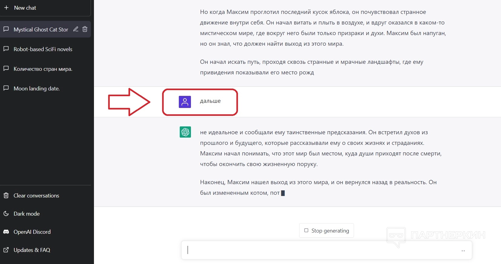 написал часть текста и остановился, либо дал неполный ответ, в этом же диалоговом окне можно попросить нейросеть продолжить, дав команду «дальше», «еще», «продолжай». У ChatGPT есть лимит — не более 500 слов на однократное сообщение-ответ в чате.