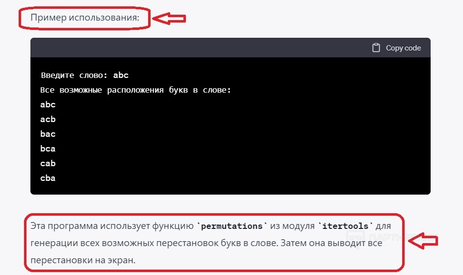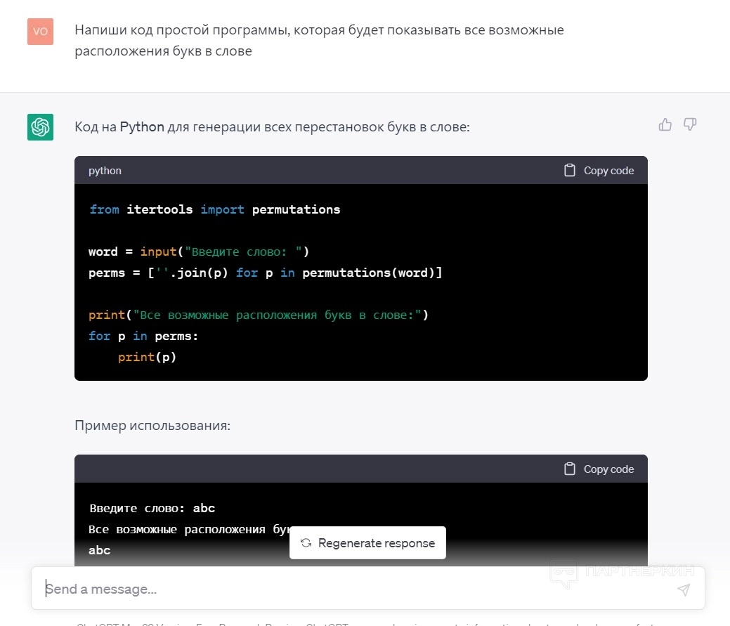 Нейросеть владеет несколькими языками программирования. Она может писать простые программы и приложения, например программу, которая покажет все возможные способы расположения букв в слове: