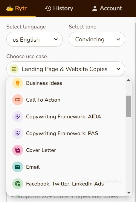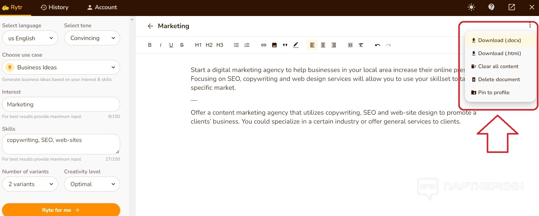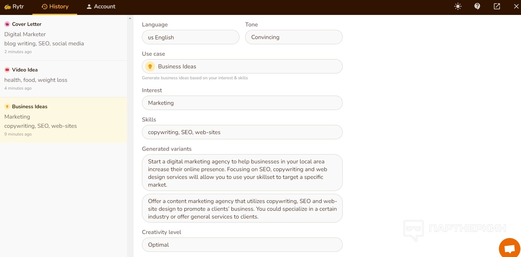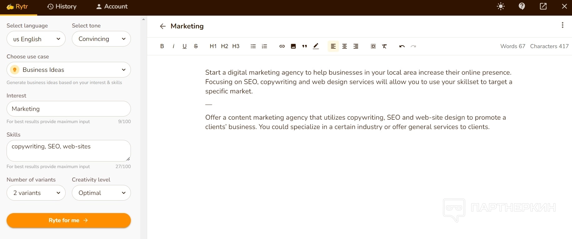 - Бизнес-идеи. Rytr помогает генерировать идеи и возможности для стартапов, соответствующих навыкам и увлечениям.