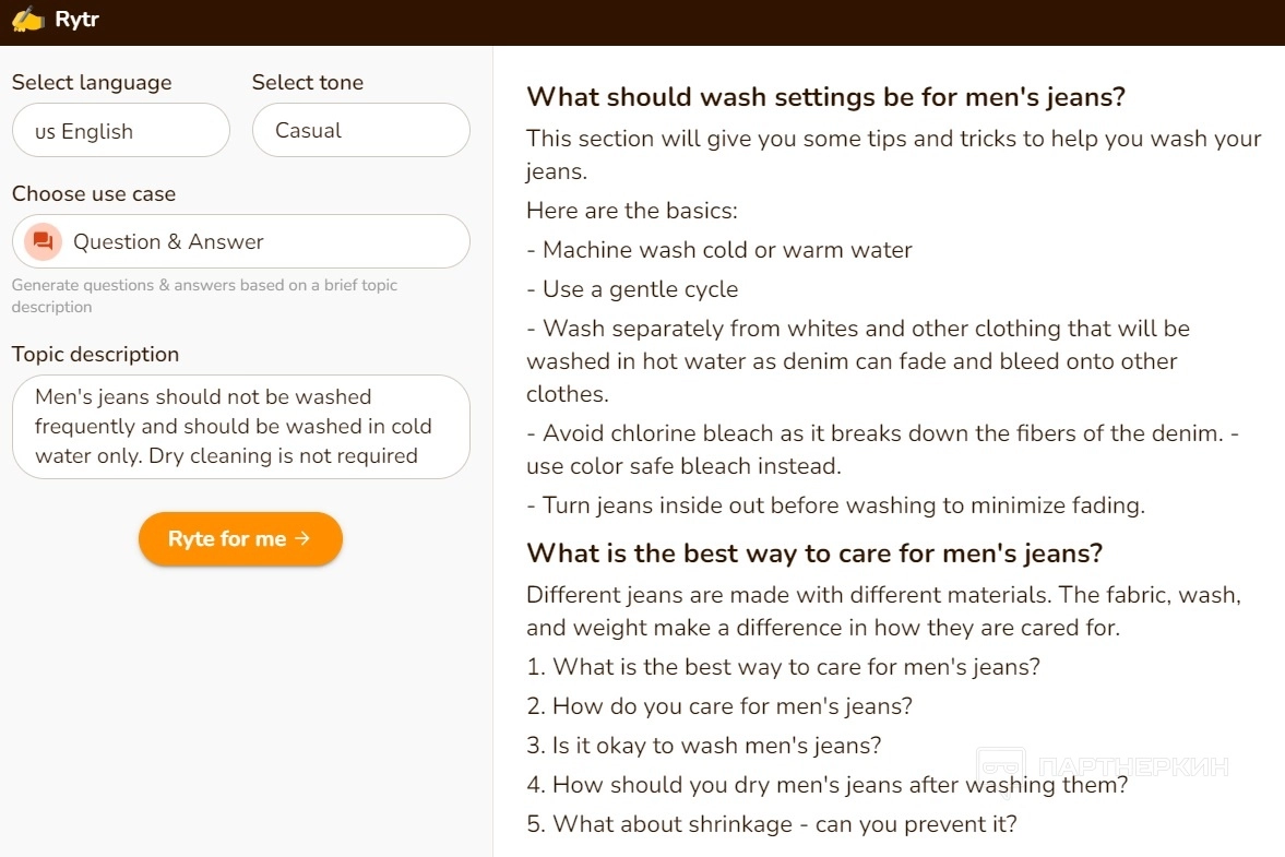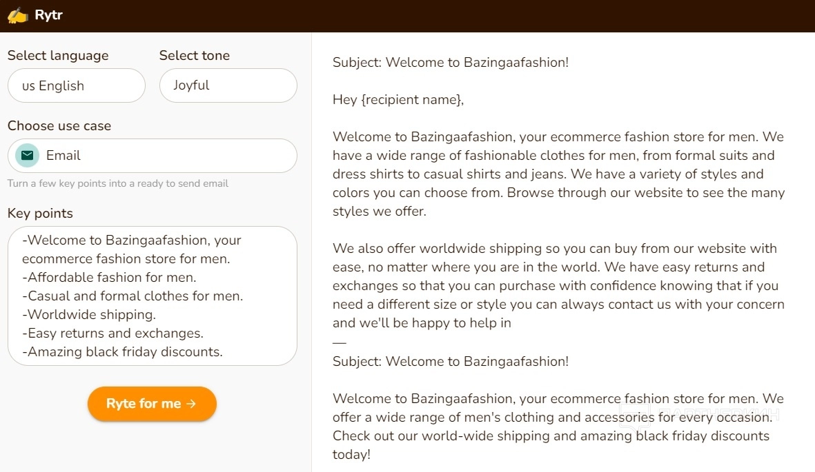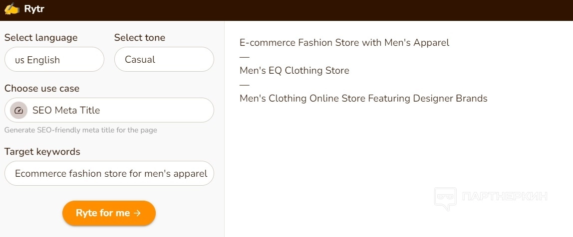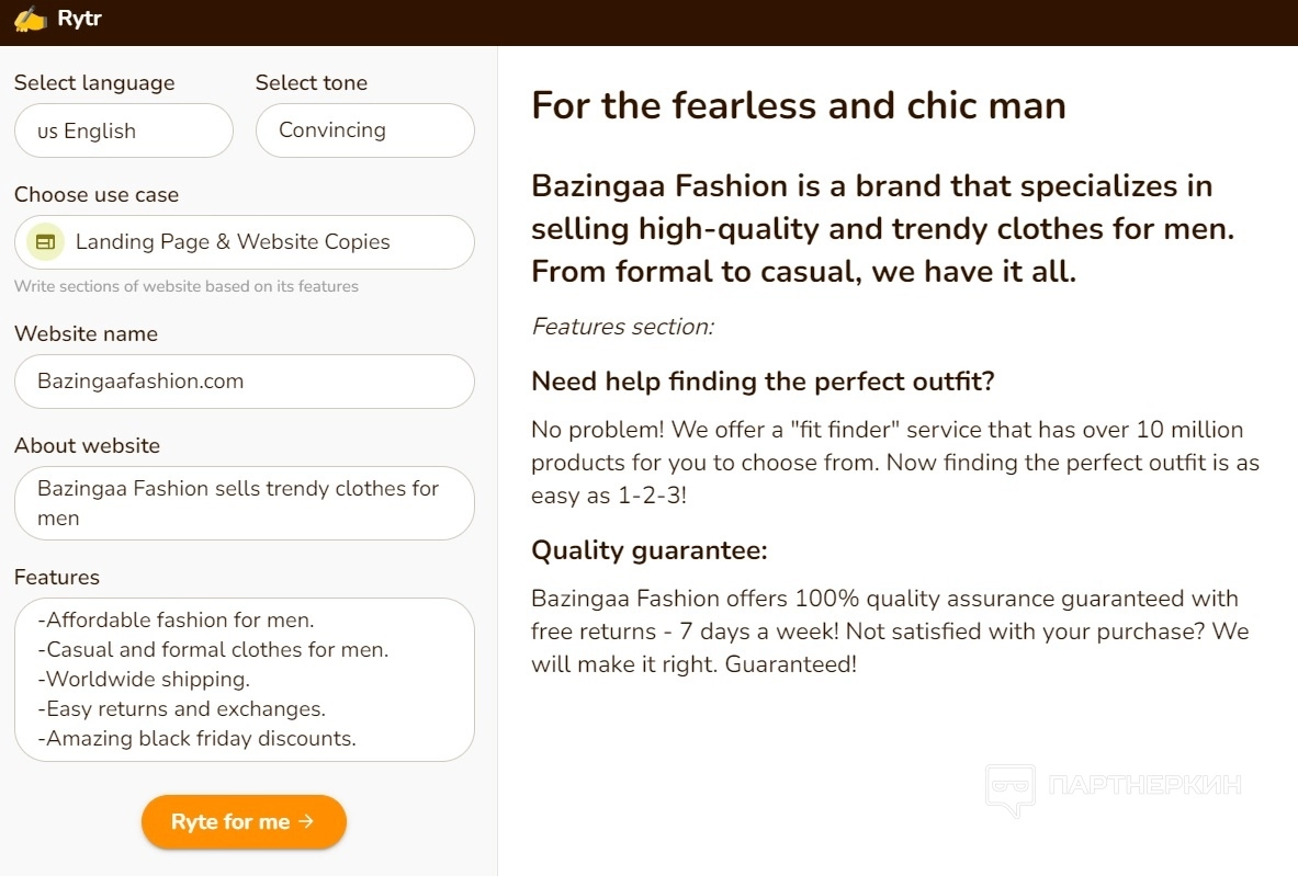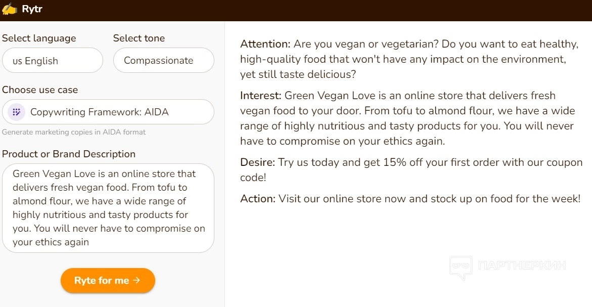 После того, как заданы все параметры — язык, тон, описание контекста, уровень креативности, нужно нажать на оранжевую кнопку «Ryte for me». Сервис выдаст результат в поле справа — редакторе.