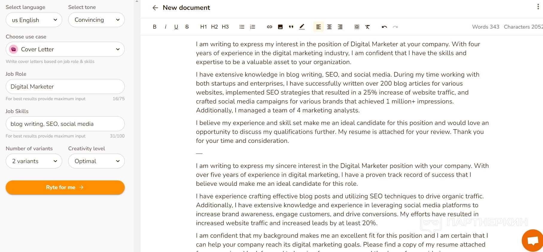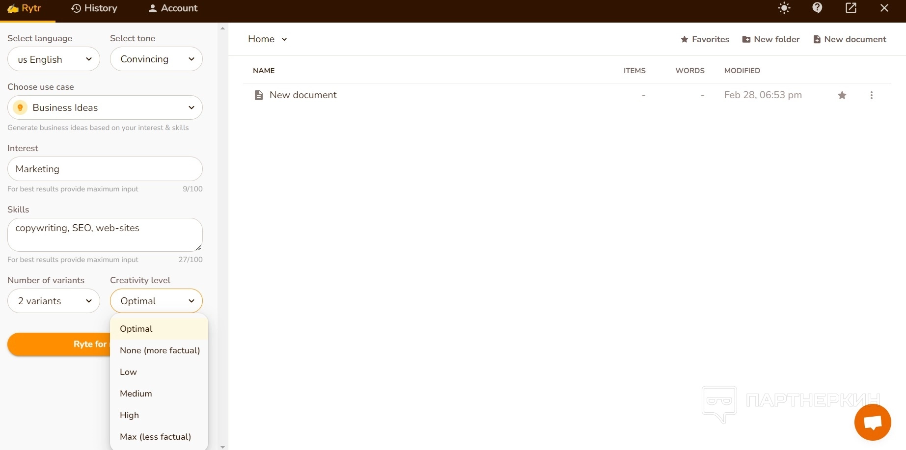 Чтобы создать новый документ, нужно заполнить свои данные — язык, тон, контекст и выбрать Ryte for me.